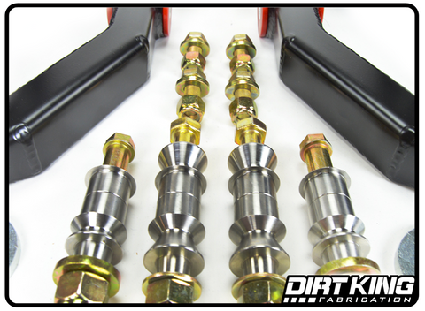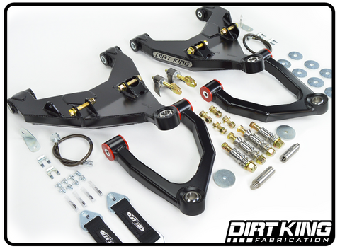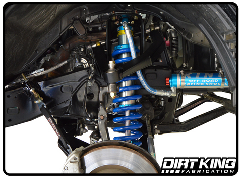 The Dirt King long travel kit was developed to drastically improve the vehicles off-road handling without compromising its day to day driving characteristics. This suspension system allows for 13.5” of travel and accepts up to a 35” tire. The kit is compatible with 2WD models and 4WD models along with the purchase of extended axle shafts. Our upper and lower arms are designed with 1” stainless steel uniballs for the outer pivots instead of ball joints for strength and increased articulation. Compared to the competition we’ve gained several inches of ground clearance by mounting the lower arms in the factory location instead of below it. This kit is CAD designed, thoroughly tested, and 100% made in America resulting in a product we’re proud to put our name on!