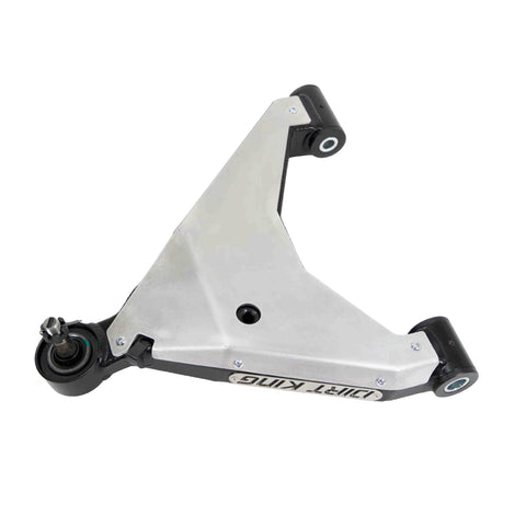 Additional features on the Dirt King lower control arms include recessed shock mounting with a drain hole and accepts all types of shocks and struts. It also accommodates for bump stops and limit straps. Progressive steering stops limit the steering throughout the suspension cycle to allow for maximum steering without over articulating the CV's or tie rods. This product is a direct bolt on application with all necessary hardware included. The arms are coated with a durable black powder coat and all the wearable components are replaceable for a product that will last a lifetime.